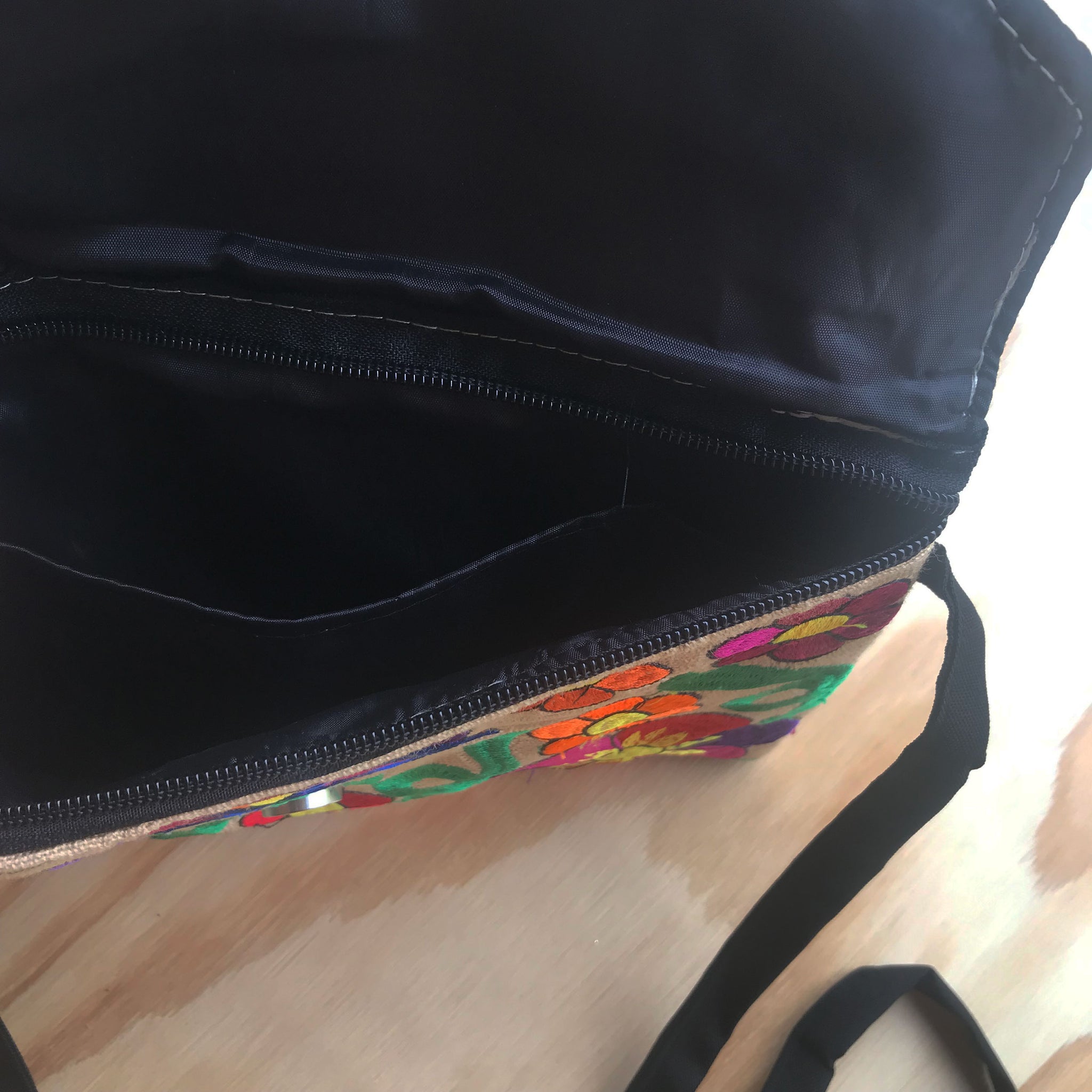 Beautiful clutch purse featuring embroidered details. Inside you will find a zipper, dividing pocket, silver magnet closure, and a black canvas strap. The colors are truly breathtaking!