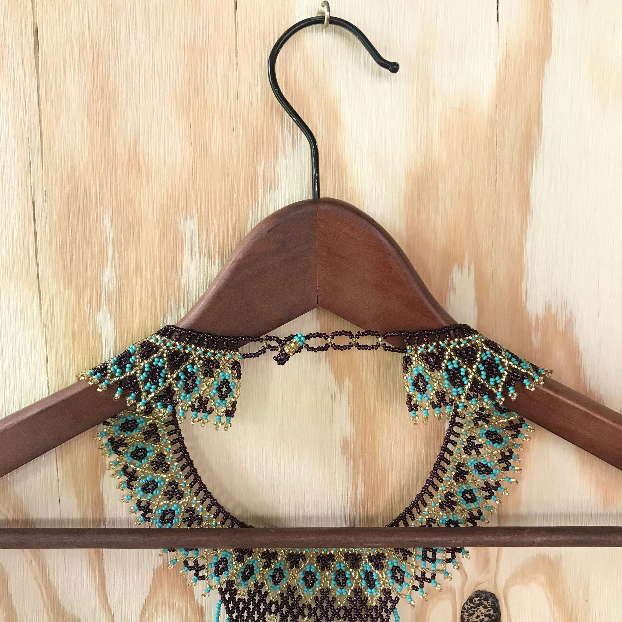 Statement necklace! Beaded necklace with fringe accents and a V shape. Features turquoise, purple, and gold beads.