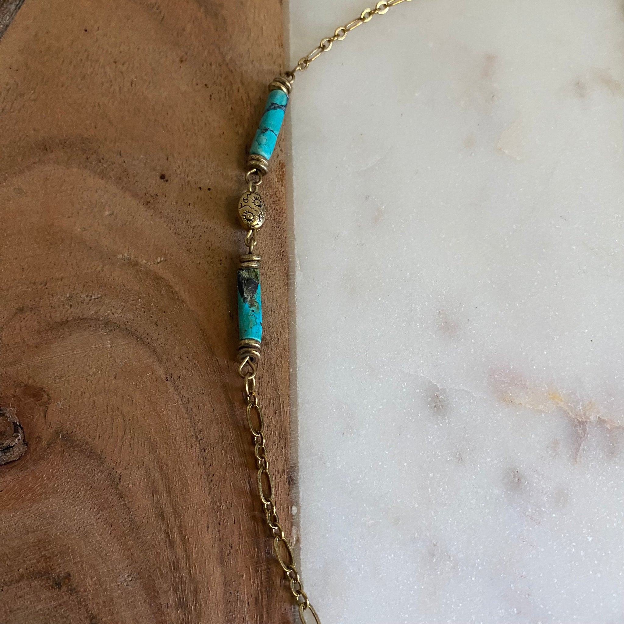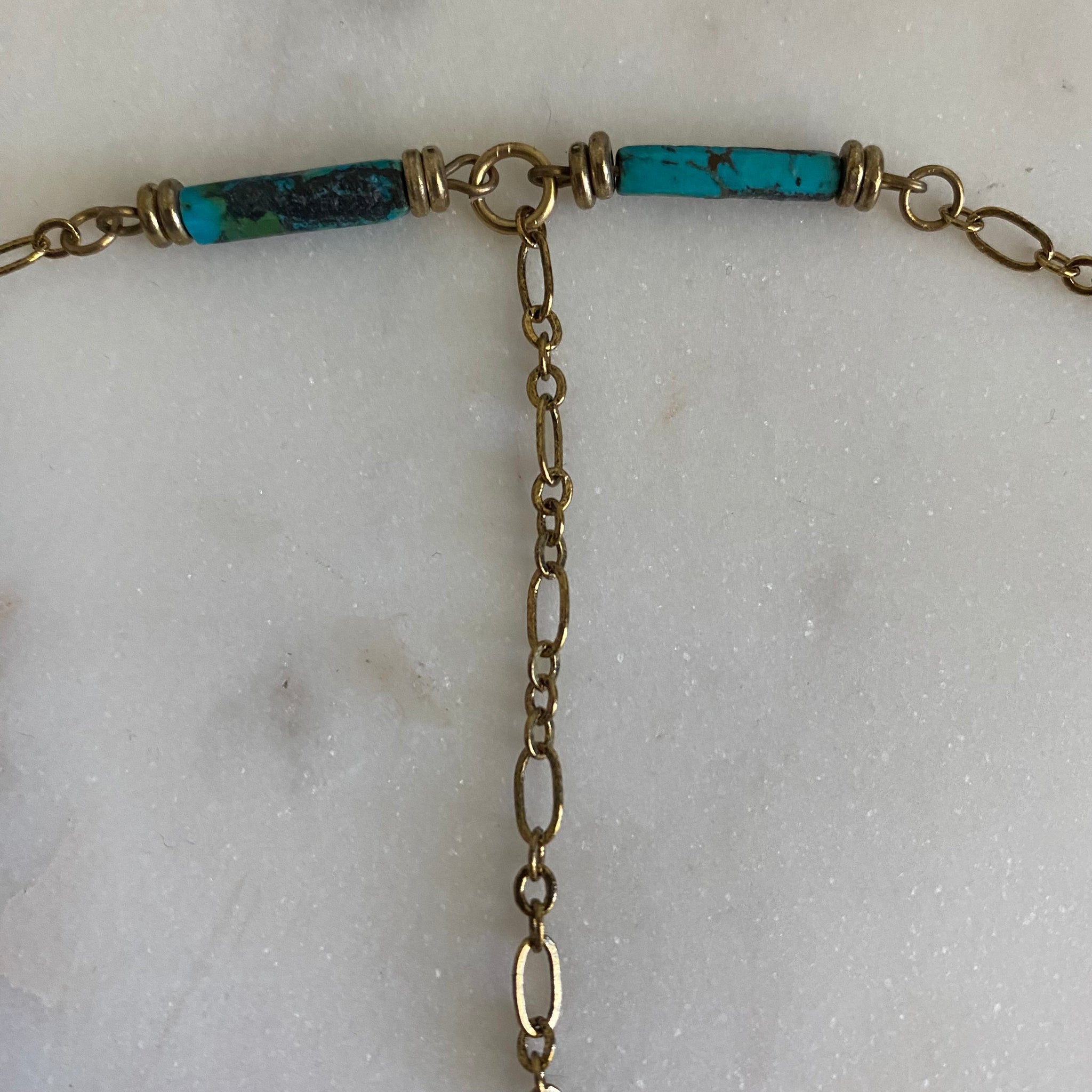 Embrace the goddess in you with a beautiful head chain. Made from brass chains and recycled turquoise beads. Interested in our Eucalyptus Maxi Dress? Find it here.